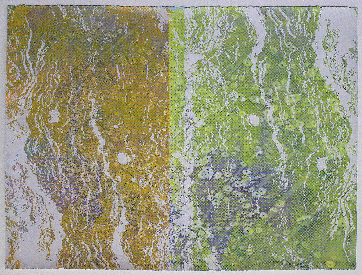 This print was inspired by a visit to King's Row Cave in Colorado. I marbled the paper and then screen printed on top of it.
